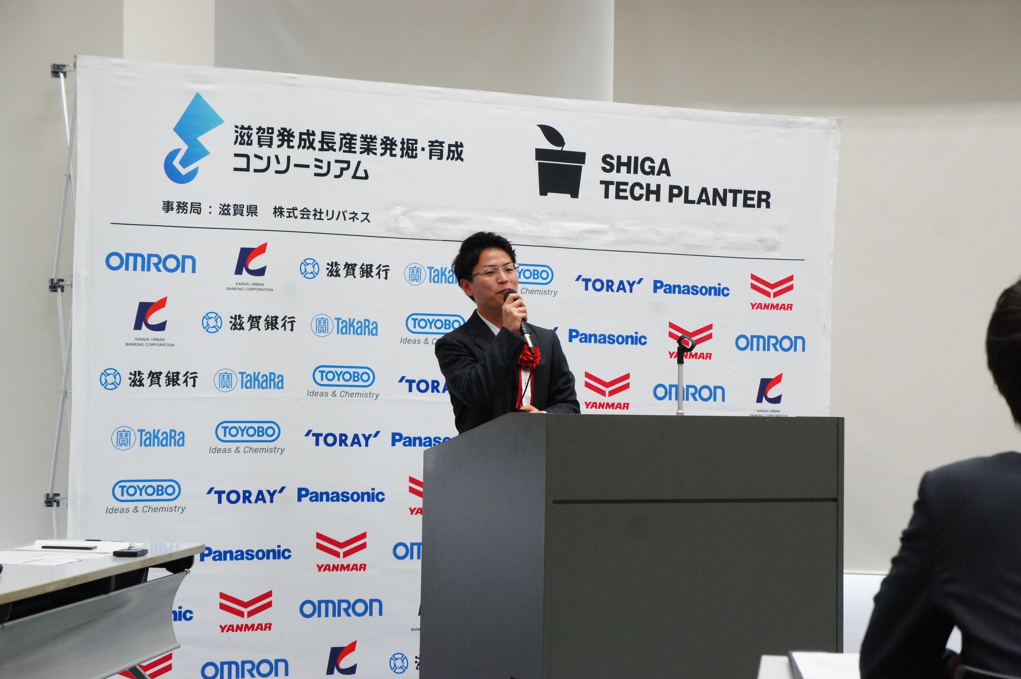 また当日は、第3回滋賀テックプラングランプリでパナソニックアプライアンス賞を受賞し、滋賀大学発ベンチャー認定制度第1号として今年1月に起業された株式会社イヴケア 代表取締役社長の五十棲氏による基調講演と、採択チーム同士のポスター交流会も実施しました。